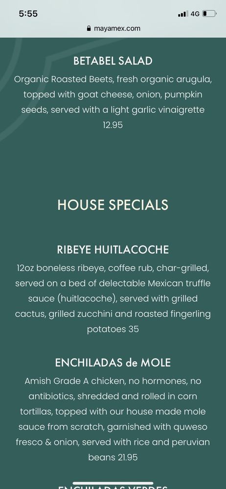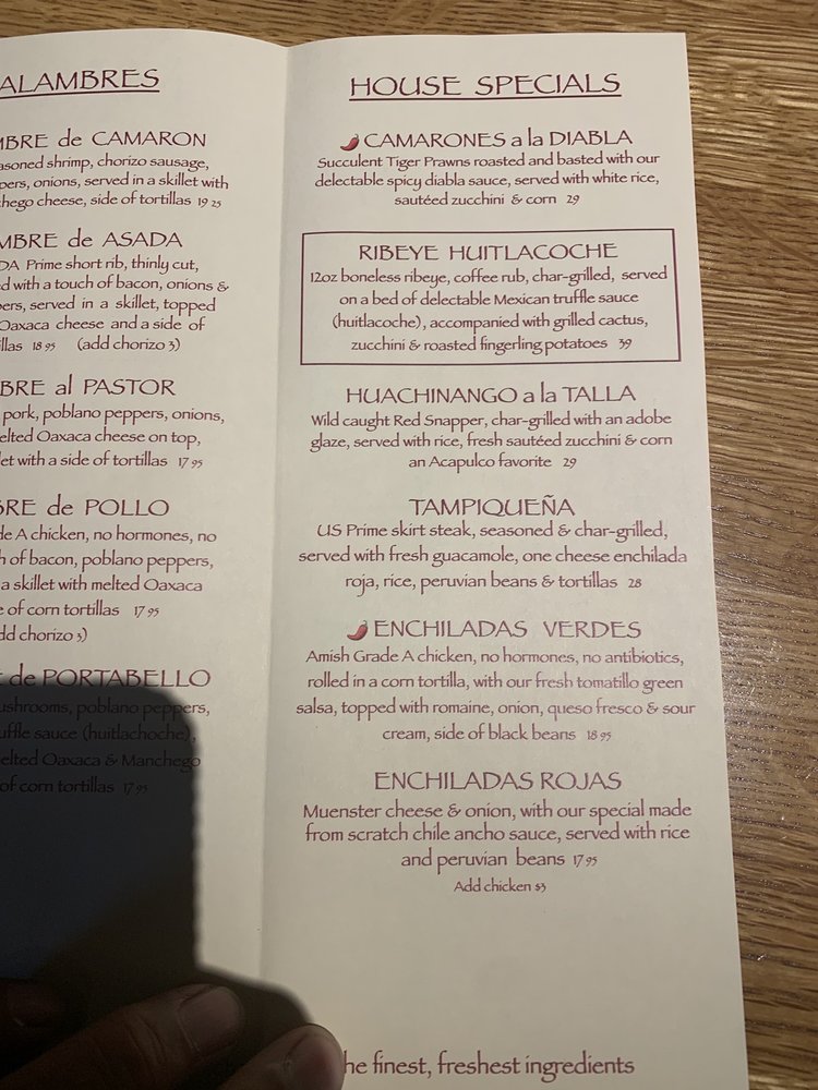 oz boneless ribeye, coffee rub, char-grilled, served on a bed of delectable Mexican truffle sauce (huitlacoche), accompanied with potatoes gratinados baked and topped with manchego cheese, plus sautéed zucchini and corn