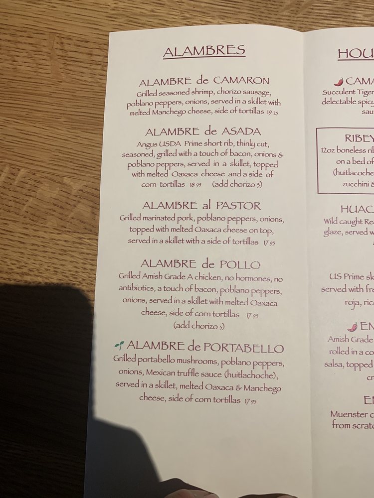 Grilled seasoned shrimp. Severed in a skillet with onions, poblano peppers, chorizo sausage, topped with melted Manchego cheese & a side of corn tortillas